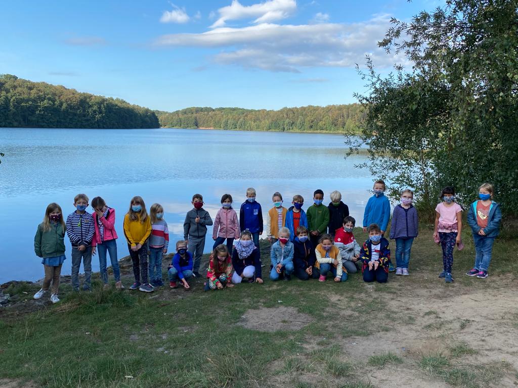 Die Kinder der Klasse 2a verbinden einen Morgenspaziergang durch den Baerler Busch mit kleinen Sportintervallen.
