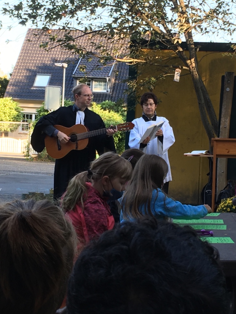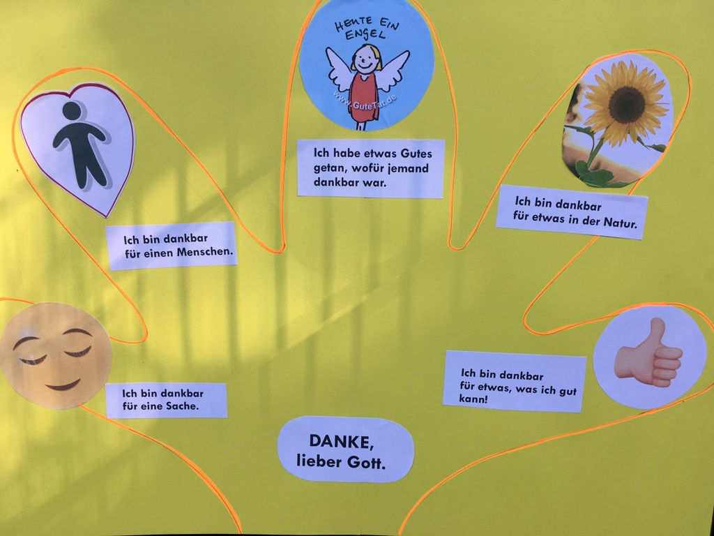 Zum Thema „Dankbar sein“ dachten die Kinder mit der „5-Finger-Methode für mehr Dankbarkeit“ darüber nach, wofür sie in ihrem Leben dankbar sind. Und wer ihnen schon einmal dankbar war, als sie Gutes getan haben. Gemeindereferentin Katrin Stürznickel sammelte Gedanken dazu mit den Kindern. Die Liedtexte wurden gesprochen statt gesungen, begleitet von den Gitarrenklängen von Pfarrer Klumb. So wurde der „Gottesdienst am anderen Ort“ zu einem schönen Erlebnis.