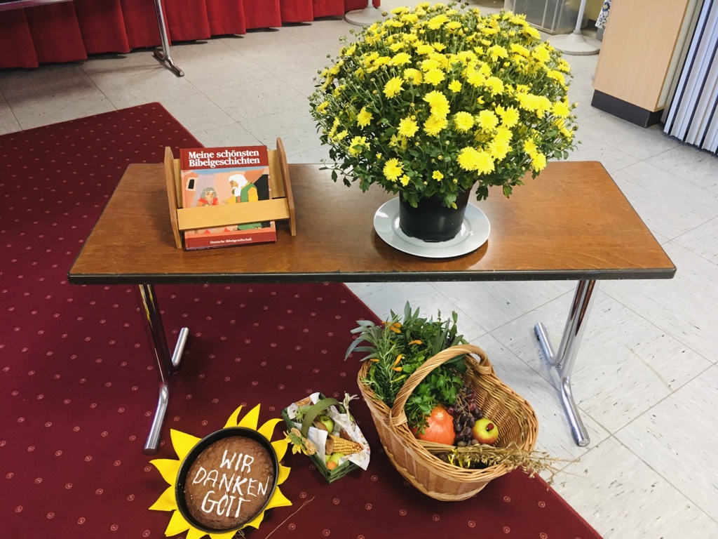 Die 4. Klässler feierten ebenfalls einen Gottesdienst unter "Coronabedingungen". Wetterbedingt trafen sie sich Klassenweise in unserer Aula und dachten in ihrem Schulgottesdienst ebenfalls über das "Danken" nach. Der schön geschmückte Erntetisch half dabei.