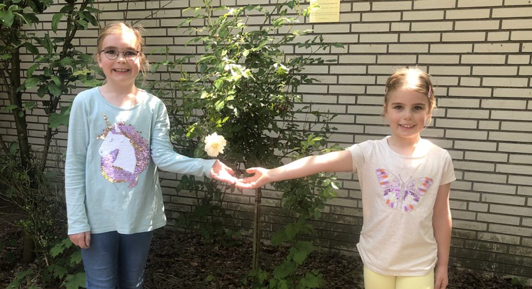 Nia und Lea von der evangelischen Grundschule an der Waldstraße in Duisburg-Baerl freuen sich. Ende Mai zeigt sich endlich die erste weiße Rose am Rosenbäumchen im „grünen Klassenzimmer“ auf dem Schulhof. Darauf haben sie schon gewartet, denn sie beobachten „ihre Lutherrose“ ganz genau – schließlich haben Kinder der Waldschule die Rose selber gepflanzt. „Das war im Lutherjahr, während unserer Projektwoche“, erzählt die kommissarische Schulleitung Katharina Sorbe. „Damals haben sich alle Kinder auf vielfältige Weise mit Martin Luther und seiner Zeit befasst und natürlich auch sein Zeichen, die Lutherrose, kennengelernt. Das Schülerparlament pflanzte dann als krönenden Abschluss der Projektwoche ein Rosenstämmchen ein. Es erinnert uns als evangelische Schule an den Anfang der evangelischen Kirche.“ Gegossen wird die Lutherrose der Waldschule regelmäßig – von den Waldschulkindern, zum Beispiel von Nia und Lea.